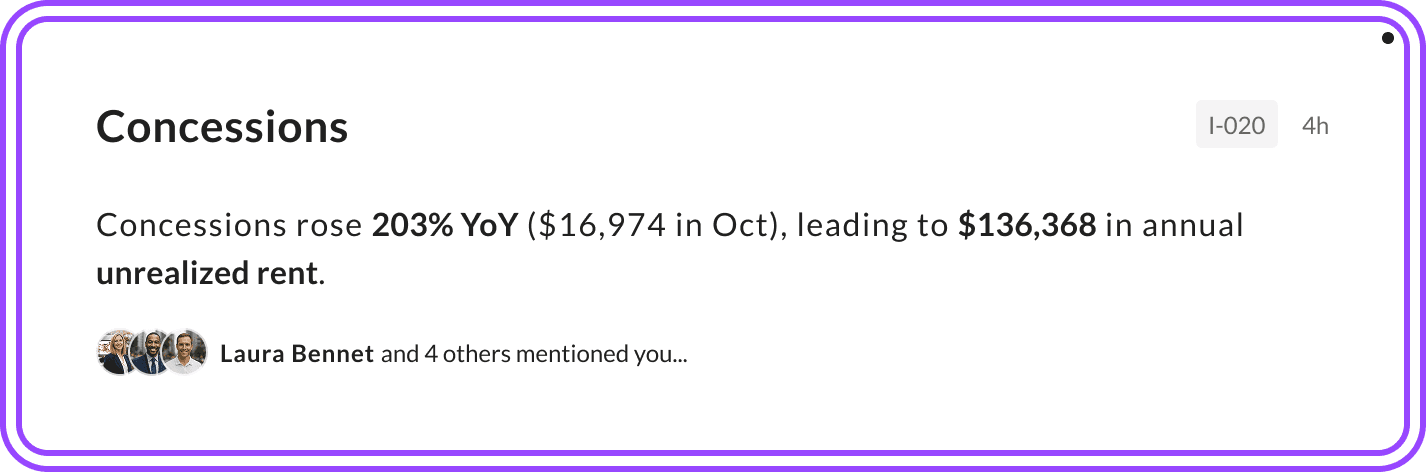 I want an Insight whenever concessions increase by more than 2% MoM while occupancy increases by less than 5% MoM. If that happens, show the specific floor plans with the largest increase in concessions over the same period of time