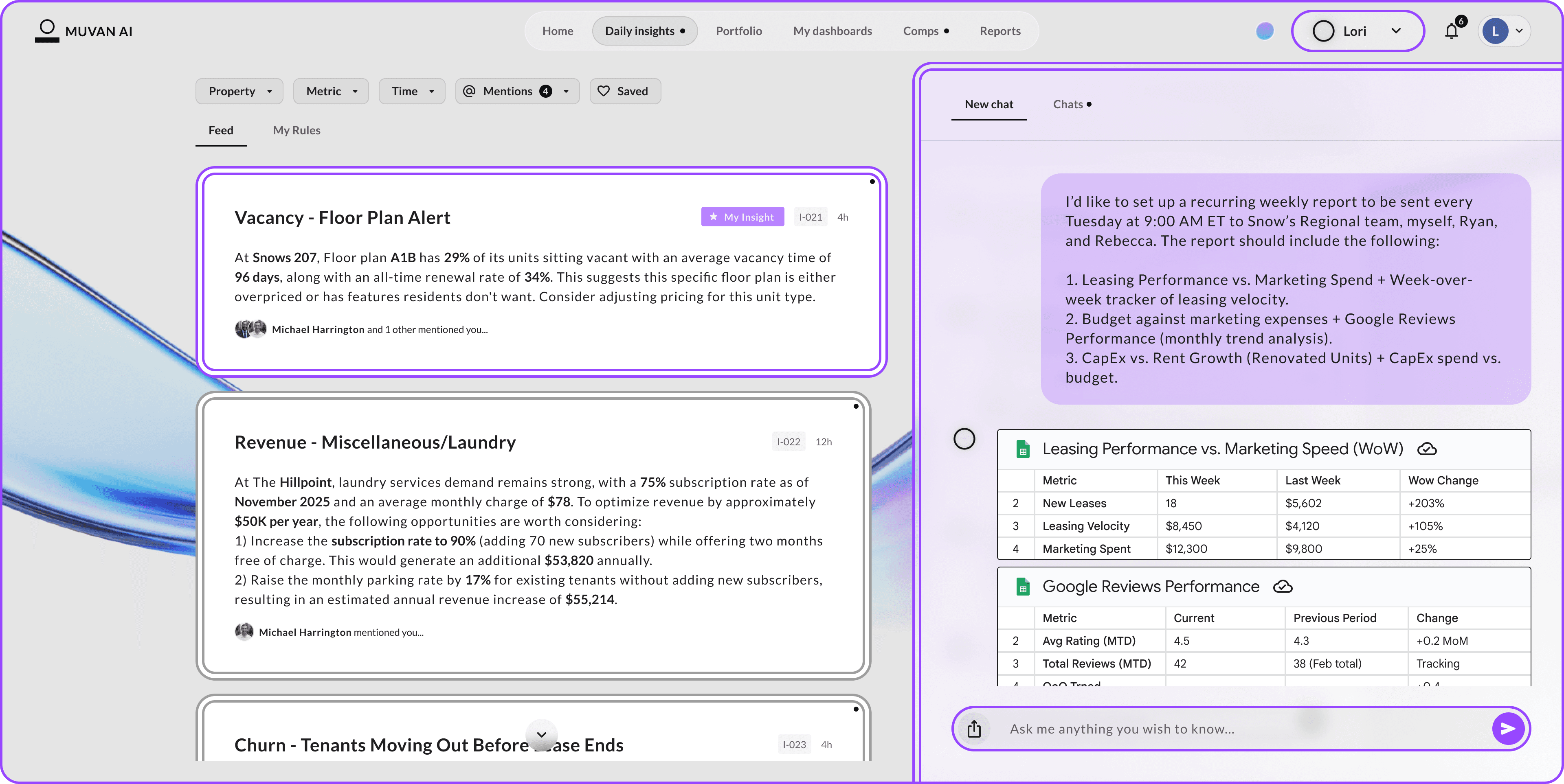 "I’d like to set up a recurring weekly report to be sent every Tuesday at 9:00 AM ET to Snow’s Regional team, myself, Ryan, and Rebecca. The report should include the following: 1. Leasing Performance vs. Marketing Spend + Week-over-week tracker of leasing velocity 2. Budget against marketing expenses + Google Reviews Performance (monthly trend analysis) 3. CapEx vs. Rent Growth (Renovated Units) + CapEx spend vs. budget "